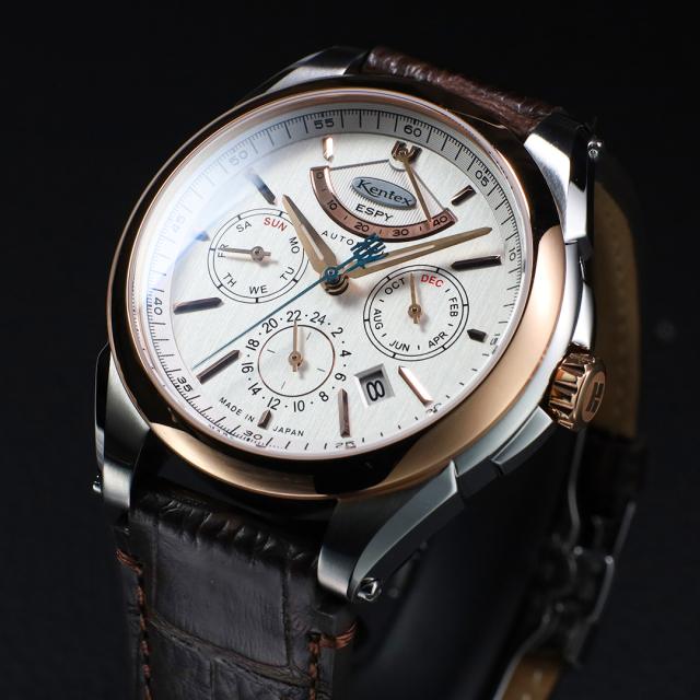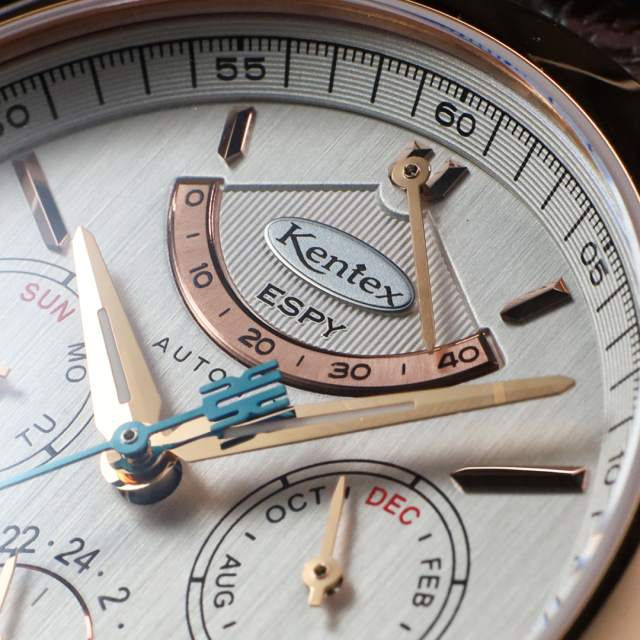 The ESPY Active 3, Kentex’s dress-sport line, is powered by a Japanese high-beat automatic movement and features a multi-calendar with power reserve, date, day, and month displays, housed in a refined 41mm case.