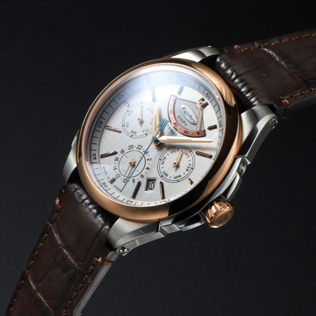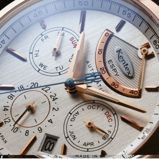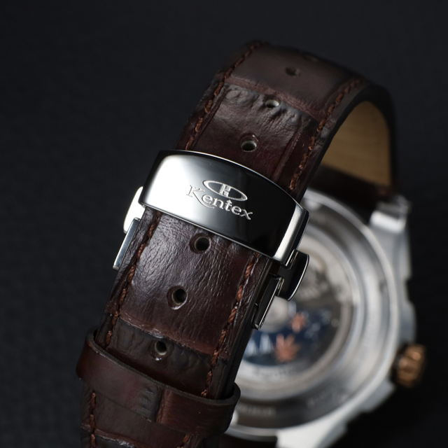 国産ハイビート自動巻きムーブメントを搭載した、ケンテックスのドレススポーツライン「ESPY Active 3」。パワーリザーブ、月・日・曜日表示を備えた本格マルチカレンダーを、洗練されたΦ41mmケースに収めました。両面カーブサファイアガラスとヘアライン文字盤が上質な表情を生み、10気圧防水により実用性も確保。裏スケルトンから覗くローターには、日本の美意識を映した紅葉モチーフをあしらい、機械式時計ならではの鼓動と情緒を静かに語ります。力強さと品格を兼ね備えた、大人のための機械式時計。
