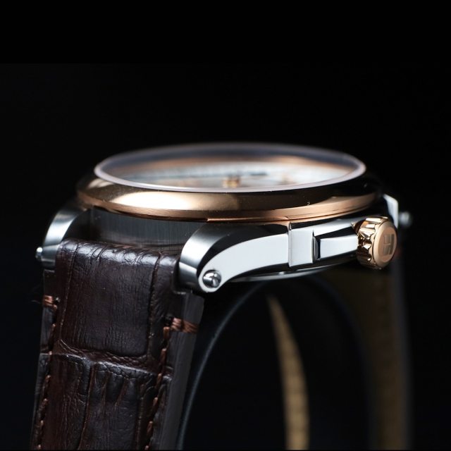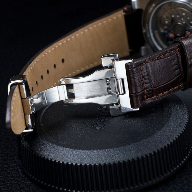 レザーベルトには、ダークブラウンの型押しクロコ調カーフレザーを使用。上質な艶感が時計全体の品格を引き立てます。バックルには、革を傷めにくく着脱もスムーズな、バタフライ式Dバックルを採用しています。