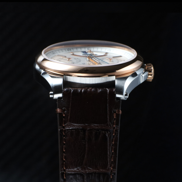 文字盤は、繊細なヘアライン仕上げを施したシルバーダイヤルに、ローズゴールドのインデックスが優しく調和し、柔らかな輝きの中に上品で温かみのある気品を感じさせるデザイン。丹念に面取りを施したパワーリザーブインジケーターの上質感と、ブルースティールの秒針が美しく映える、エレガントなモデル。