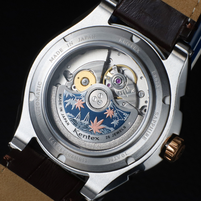 The exhibition case back reveals a rotor with a Japanese autumn leaves motif, reflecting Japanese aesthetics and the quiet charm of mechanical watchmaking.