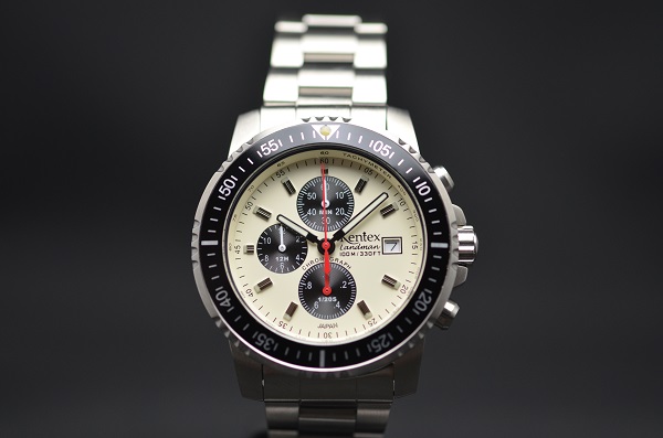 - 日本製クロノグラフクォーツ、1/20秒計(6時位置)、12時間計(9時位置)、60分計(12時位置)、デイト表示