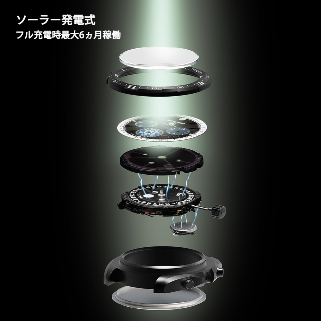 - 日本製ソーラークロノグラフ、デイト表示、駆動時間:6ヶ月(フル充電時)、充電時間:5時間(太陽光下)・47時間(蛍光灯下)