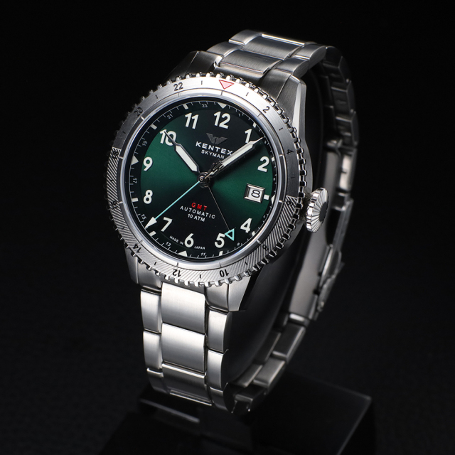 パイロットウォッチ「SKYMAN」シリーズに、新たなGMTモデルが登場。 Φ41.0mmのケースに、最大3つのタイムゾーンを同時表示できる両方向回転式GMTベゼルを搭載。視認性に優れたオールアラビアインデックスや、グローブ越しでも確実に操作できるビッグクラウンなど、パイロットウォッチの血統を受け継ぐ機能美を随所に備えています。 風防には無反射コーティングを施したサファイアクリスタルを採用。日本製ムーブメントは自社で0~+25秒まで精密に調整し、確かな精度を実現しています。