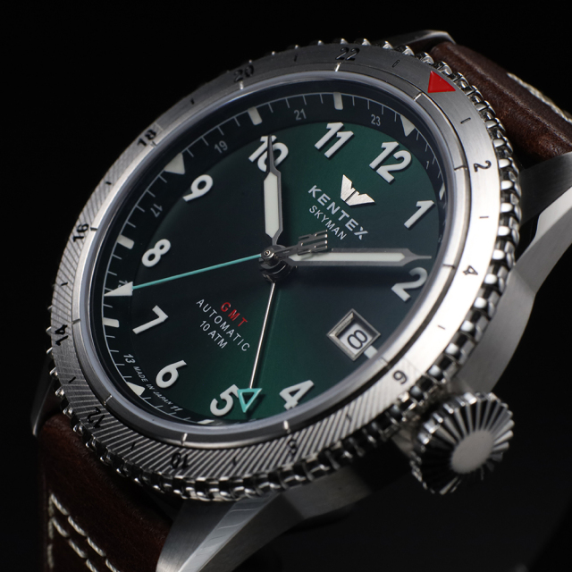 SKYMAN GMTは、日本製自動巻きムーブメントと最大3つのタイムゾーンを表示するGMT機構を搭載。無反射コーティングを施したサファイアガラスがクリアな視界を確保し、強蓄光アラビアインデックスは昼夜を問わず高い視認性を発揮。パイロットウォッチの伝統を受け継ぐビッグクラウンと、100M防水による確かな実用性を備えた、本格派の「ジャパンメイドGMT」です。