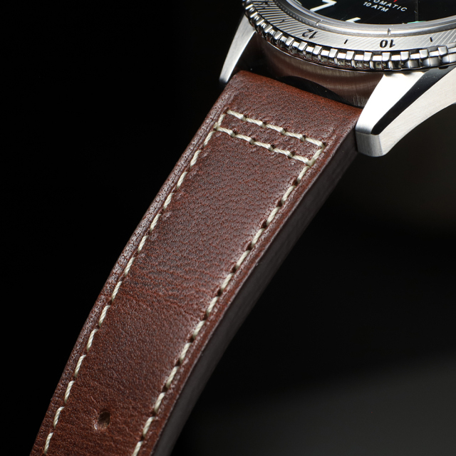 リューズは、グローブ越しでも確実に操作できるビッグクラウン仕様で、往年のパイロットウォッチを想起させるクラシックなデザイン。確かな実用性と伝統が息づく繊細なディテールです。