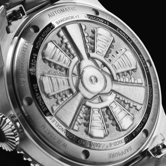 裏蓋には、プロペラ機のレシプロエンジンをモチーフにした型打ち加工を施し、立体的かつ精緻な仕上げで高級感を演出。航空機の歴史とパイロットの精神を宿す、スカイマンの象徴的デザインとなっています。
