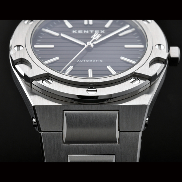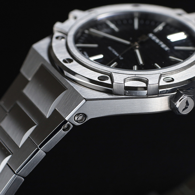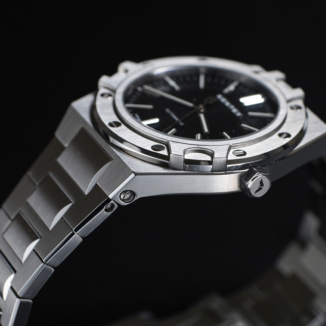 悠久の時を感じさせる海をテーマに、船の”舷窓”をモチーフにデザインされたユニークなベゼルは、緻密なCNC加工によりシャープさと立体感が際立つ仕上がりに。またベゼルに施されたミラー仕上げの飾りネジは、光を受けて美しく輝き、デザイン全体にアクセントを加えています。