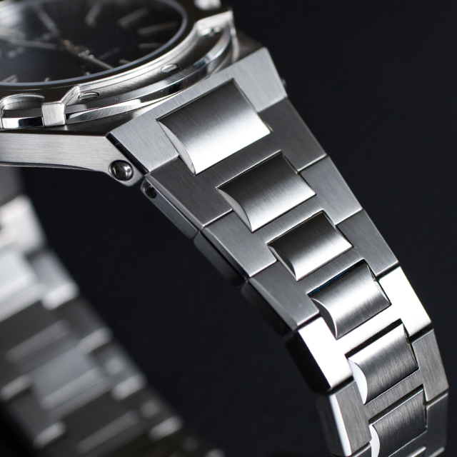 時計の仕上げは、国産時計最高の研磨技術であるザラツ研摩が施され、歪みのない鏡面とヘアラインのシャープな仕上げ分けが、あらゆる角度から品格のある存在感と高級感を放ちます。