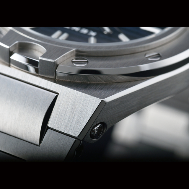 ベルトは、ケースラグから滑らかに一体感を持ってつながるインテグレート式メタルブレスレット。ヘアライン仕上げに加えて、随所に施された細かな面取りのミラー仕上げ美しく輝き、本格時計にふさわしい高級感と品格を宿しています。E901X-01(鉄紺)の限定モデルには、メタルブレスレットとともに、交換用のレザーベルトが標準で付属し、交換は付属のミニ六角レンチを使用することで、オーナー様自身で交換出来るようになっています。